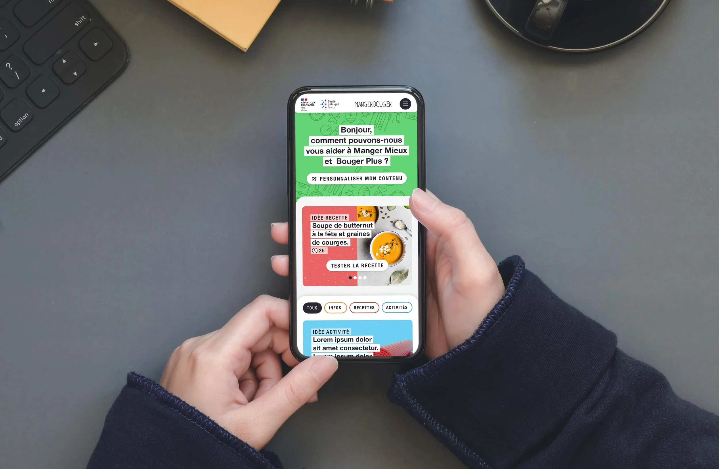 Manger Bouger s’inscrit dans le Programme National Nutrition Santé (PNNS) du gouvernement français et traite de la nutrition comme facteur déterminant de la santé.